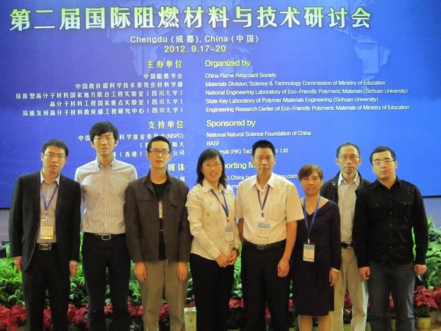 由挂靠在北理工的中国阻燃学会和四川大学共同举办第二届国际阻燃材料与技术研讨会(2nd International Symposium on Flame Retardant Materials & Technologies,ISFRMT 2012),2012年9月17日至20日,在成都召开。我校材料学院阻燃材料研究国家专业实验室、火安全材料与技术教育部工程研究中心的周政懋教授、杨荣杰教授、李定华、李向梅、杜建新、仪德启老师,以及博士研究生范海波、周友、李紫千共九人参加了此次国际会议。